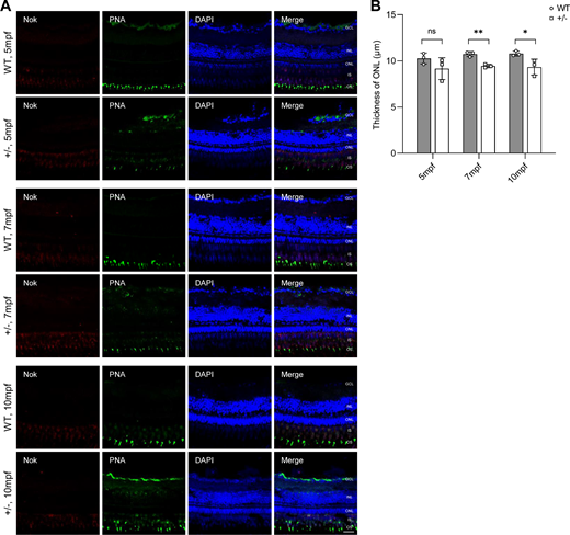Fig. 4 Mild but progressive retinal degeneration in adult dync1h+/− zebrafish. (A) Immunofluorescence-stained cryosections at indicated ages showing the PRC IS/OS stained with anti-Nok and PNA; nuclei stained by DAPI. (B) Quantitative analysis of ONL thickness in WT and dync1h1+/− retinas over time. +/−, dync1h1 heterozygote. Scale bar = 20 µm. Data are shown as mean ± SD. Not significant (ns), P > 0.05, *, P < 0.05; **, P < 0.01, n = 3 biologically independent samples per group. DAPI, 4′,6-diamidino-2-phenylin-dole; IS/OS, inner segment/outer segment; Nok, nagie oko; ONL, outer nuclear layer; PNA, peanut agglutinin; PRC, photoreceptor cell; SD, standard deviation; WT, wild type.