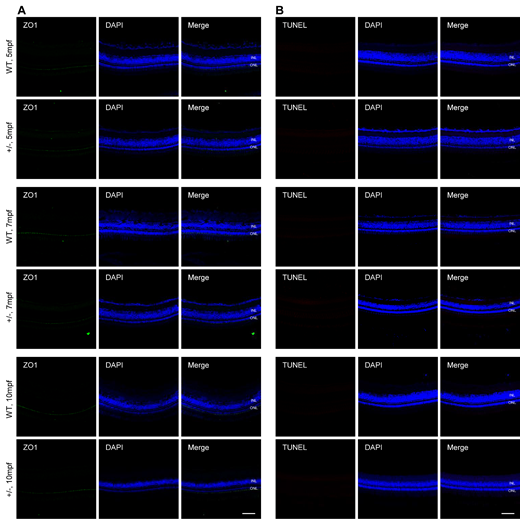 Fig. 5 Dync1h1-deficiency maintains OLM integrity and PRC survival in adult dync1h+/− retina. (A) Immunofluorescence-stained cryosections at indicated ages showing OLM stained with anti-ZO1; nuclei stained by DAPI. (B) TUNEL assay images at indicated ages with DAPI-stained nuclei. +/−, dync1h1 heterozygote. Scale bar = 50 µm. DAPI, 4′,6-diamidino-2-phenylin-dole; OLM, outer limiting membrane; PRC, photoreceptor cell.