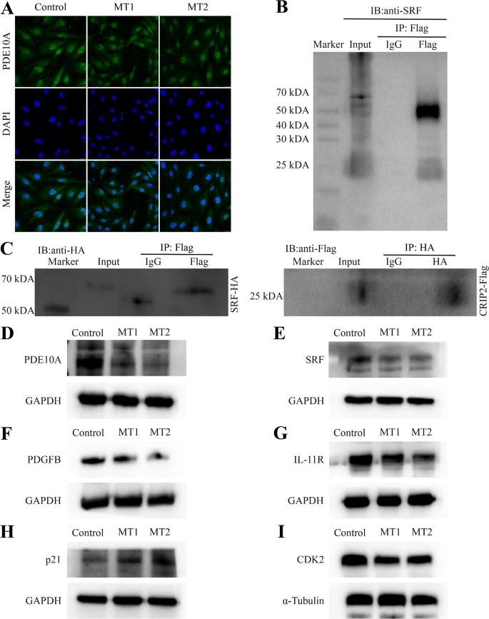 Fig. 9 SRF interacts with CRIP2, and the expression of its downstream genes is modulated by CRIP2. (A) Immunofluorescence analysis of PDE10A expression after CRIP2 depletion. DAPI was used to stain the nucleus. (B) Detection of SRF in the immunoprecipitation derived from cell lines overexpressing CRIP2. (C) CRIP2 coimmunoprecipitates with SRF. (D–I) Analysis of the altered protein levels of PDE10A, SRF, PDGFB, IL-11R, p21, and CDK2 in response to CRIP2 deficiency