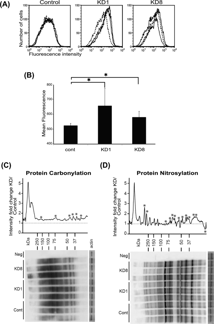 Fig. 5 Selenon knock down cells present increased ROS levels when compared to control. (A) Flow cytometry assay of CM-H2DCFDA stained cells to measure ROS levels in selenon knock down (KD1 and KD8) and WT control cells. (B) Quantification of fluorescence from (A) reveals significant increase of ROS levels in selenon KD cell lines when compared to control. (C) Immunoblotting of protein carbonylation and (D) nytrosylation demonstrate increased levels in selenon KD when compared to control cells