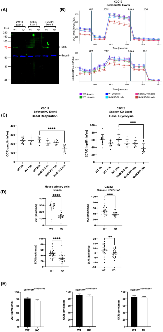 Fig. 6 Selenoprotein-N null myoblasts show impairment in metabolism after differentiation at high cell seeding confluency. (A) Immunoblot shows absence of ~ 65 kDa SelN in three selenon-null myoblast lines: C2C12 Exon 3, C2C12 Exon 5, and mouse quadriceps primary cells (Quad PC). α-Tubulin was used as a loading control and is present at ~ 52 kDa in all lines. (B) Results from seahorse cell respirometer show changes in Oxygen Consumption Rate (OCR) and Extra Cellular Acidification Rate (ECAR) parameters at different cell plating densities of selenon-null C2C12 Exon 5 cells. (C) Quantification of OCR and ECAR in increasing concentrations of C2C12 selenon-null exon 5 myoblasts show significant differences when compared to wild type only at 20,000 cell density (N = 10). (D) Quantification of basal OCR and ECAR in C2C12 selenon-null exon 3 and one mouse quadricep primary selenon-null cell lines shows impaired metabolism in KO myoblasts when compared to WT at 20,000 cell density (N = 30). (E) Quantification of basal OCR in three 1 dpf selenon-mutant zebrafish embryos show no differences in metabolism in mutants when compared to WT (N = 48). “**” = p < 0.01, “***” = p < 0.001, “****” = p < 0.0001