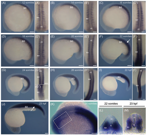 Fig. 2 Spatio-temporal expression of rbm24b transcripts during zebrafish development. (A–K) Lateral views, with anterior to the left, of whole-mount embryos from 10-somite stage to 24 hpf, showing rbm24b expression in the developing somites. (A′–I′) Dorsal views, with anterior to the top, of embryos shown in A-I, focused on the developing somites. (K) Weak rbm24b hybridization signal (outlined by dashed rectangle) can be observed in the heart area with prolonged incubation period for chromogenic reaction. (L) Transverse section of the embryo at 20-somite stage shown in F, at the level of somite (white arrow). (M) Transverse section of the embryo at 23 hpf shown in J, at the level of the somite (white arrow). So, somite; nt, neural tube; n, notochord. Scale bars: (A–K) 100 μm; (A′—I′, L, M) 50 μm.