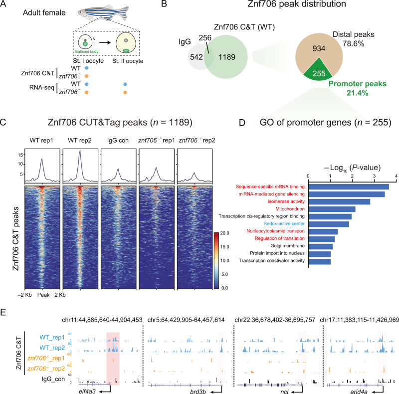 Fig. 5 CUT&Tag of Znf706 in stage I oocytes. A: Schematic showing collection of stage I oocyte for CUT&Tag of Znf706 and stage I and II oocytes for RNA-seq. B: Venn diagrams illustrating the overlap between Znf706 and IgG CUT&Tag (left) and a pie chart showing the distribution of Znf706 peaks at promoter and distal regions (right). C: Heatmap showing the Znf706 in WT and znf706−/− oocytes and IgG in WT oocytes enrichment around peak center (peak center ± 2 kb). D: Bar plot showing GO analysis of 255 genes bound by Znf706 at the promoter regions. E: UCSC Genome Browser snapshots showing Znf706 and IgG peaks at promoter regions of eif4a3, brd3b, ncl, and arid4a. Pink shadows indicated promoter regions. WT, wild-type; st., stage; C&T, CUT&Tag.