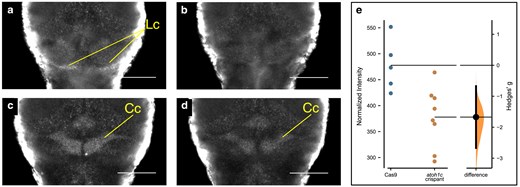 Fig. 7 Srrm4 expression is decreased in atoh1c G0 crispant larvae at 6 dpf. a, b) srrm4 expression in the lobus caudalis. a) Cas9-injected control and (b) atoh1c G0 crispant. c, d) srrm4 expression in the corpus cerebelli. c) Cas9-injected control. d) atoh1c G0 crispant. e) Quantification of srrm4 expression in atoh1c crispant and Cas9-injected control larvae. Each point represents the normalized srrm4 expression level of an individual larva. Student's t-test P = 0.009. Anterior is to the top. Cc, corpus cerebelli; Lc, lobus caudalis. Scale bar = 100 μm.