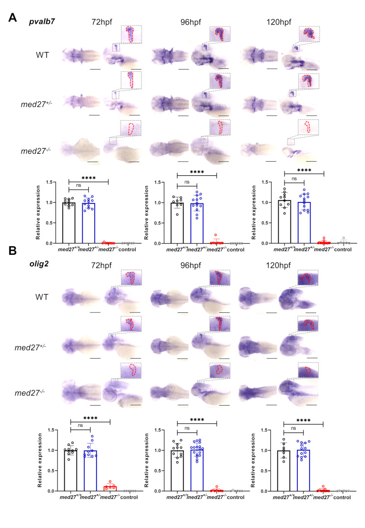med27 LoF resulted in severe cerebellar atrophy. The results presented here are from the INS10 mutant line. For results from the INS5 and DEL5 mutant lines, refer to Fig. S5 and S6. Representative dorsal and lateral views of WISH for pvalb7 (A) and olig2 (B) at 72 hpf (pavlb7: med27+/+n = 10, med2+/−n = 11, med27−/−n = 9, control n = 6; olig2: med27+/+n = 10, med27+/−n = 10, med27−/−n = 6, control n = 6), 96 hpf (pavlb7: med27+/+n = 8, med27+/−n = 13, med27−/−n = 7, control n = 6; olig2: med27+/+n = 11, med27+/−n = 17, med27−/−n = 7, control n = 6), and 120 hpf (pavlb7: med27+/+n = 10, med27+/−n = 13, med27−/−n = 13, control n = 6; olig2: med27+/+n = 7, med27+/−n = 13, med27−/−n = 9, control n = 6) in larvae of the three genotypes. Enlarged views highlight the cerebellar region on lateral views enclosed by dashed red lines, which were quantified for gene expression comparison. Error bars represent mean ± SD. Statistical analysis was performed using one-way ANOVA. ns: not significant; ****: P<0.0001