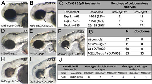 Fig. 4 fzd5sgu1 and fzd5sgu3 are genetically sensitised to developing eye malformations. (A,B,D-F,H,I) Lateral views, with anterior to the left, of 72 hpf embryos treated with DMSO (A,D,H) or XAV-939 (B,E,F,I). Colobomas (arrows in B,F,I) are evident in a subset of embryos derived from the incross of fzd5sgu1/+ (B), MZfzd5sgu1 (F) and fzd5sgu3/+ XAV-939-treated embryos (I), a phenotype never observed in wild-type XAV-939-treated embryos (E). (C,G,J) Quantification of phenotypes observed, and their associated genotypes, in XAV-939-treated embryos derived from fzd5sgu1/+ incross (C), wild-type or MZfzd5sgu1 incross (G) and fzd5sgu3/+ incross (J). Scale bar: 500 µm.