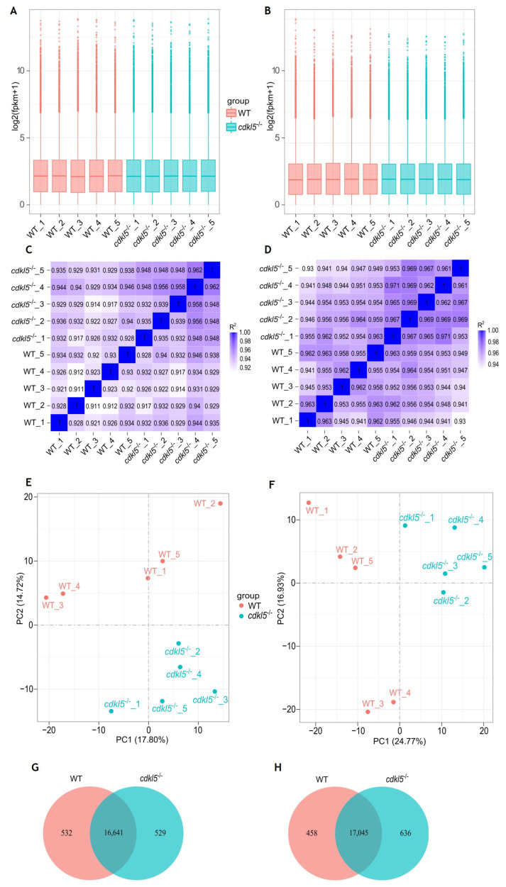Comparison of gene expression levels between cdkl5−/− mutant zebrafish and WT siblings at 5 dpf (A,C,E,G) and 35 dpf (B,D,F,H). (A,B) Box plots of the distribution of gene expression levels based on log2 transformed FPKM (Fragments Per Kilobase of transcript per Million mapped reads) values for each sample. The abscissa axis is the sample name, and the ordinate axis represents the log2 (FPKM + 1) values. (C,D) Heatmap of the square of Pearson correlation coefficients (R2) among the ten sequenced samples. (E,F) Principal Component Analysis (PCA) maps based on the gene expression value (FPKM) of samples. The abscissa axis is the first principal component (PC1) representing the most variation in the data, and the ordinate axis is the second principal component (PC2), representing the second most variation in the data. (G,H) Venn diagram of gene expression indicating the number of common and uniquely expressed genes in the WT siblings and cdkl5−/− groups.