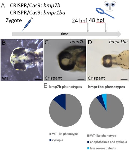 Fig. 1 Targeting of bmp7b and bmpr1ba with CRISPR/Cas9 results in cyclopia. (A) Scheme of experimental procedure. Embryos were injected at 1-cell stage and analyzed at approximately 24–48 hpf. (B) Wild-type, dorsal view. (C) bmp7b Crispant with cyclopia, ventral view. (D) bmpr1ba Crispant with cyclopia, ventral view. Scalebars indicate 200 µm. (E) Pie charts show the frequency of phenotypes in surviving embryos in bmp7b and bmpr1ba Crispants.