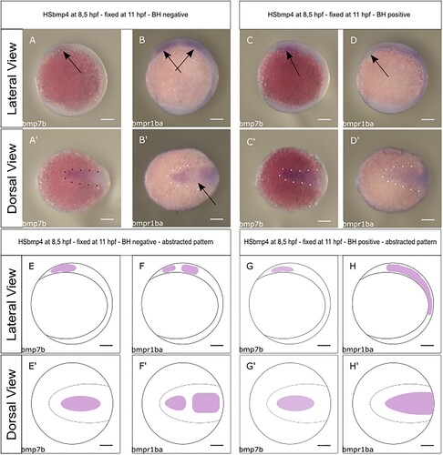 Fig. 4 Expression patterns and domains of bmp7b and bmpr1ba in inner-embryonic domains and structures after induction of bmp4 and in controls (lateral and dorsal views, the prospective head facing left). Scalebars indicate 200 µm. Scheme of experimental procedure (top): Heat shock of outcrossed transgenes tg(hsp:bmp4/cmlc2:GFP) at 8.5 hpf and fixation for whmish at 11 hpf. Genotyping and separation of recorded expression patterns (A–B′) specimens with typical expression patterns, genotyped cmlc2:GFP/bleeding heart (BH) negative. (C–D′) Specimens with typical expression patterns genotyped cmlc2:GFP/BH positive. (E–H′) Schematic drawing of the respective patterns. (A, A′, E and E′) Expression pattern of bmp7b without bmp4 induction (3 embryos, 3 embryos with pattern). Note the broad expression domain, at the anterior midline, likely corresponding to the anterior neuroectoderm. (B, B′, F and F′) Expression domain of the bmpr1ba without bmp4 induction (5 embryos, 5 embryos with pattern). Please note the two distinct and separate expression domains. The anterior domain, likely corresponds to the anterior ANP. The posterior domain likely corresponds to the region of the midbrain-hindbrain boundary. (C, C′, G and G′) Expression domain of bmp7b after induction of bmp4 (8 embryos, 6 embryos with pattern). The expression domain remains similar to the uninduced one, albeit with a slight smaller projection dorsally, seen in the lateral perspective (please note the arrow in (C)). (D, D′, H and H′) Expression domain of bmpr1ba after induction of bmp4 (16 embryos, 16 embryos with pattern). Please note the single expression domain, which mostly includes the domains seen in the control. No gap is seen separating an anterior and a posterior expression domain as seen in the control. The anterior margin of the ANP lacks expression (arrow in (D)), please see (B) as control.