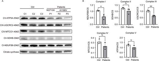 Fig. 2 (A) Western blotting of the five complexes in both the control group and the patients. (B) The analysis graph represents the ratio of the grayscale value of each complex to the grayscale value of the internal reference, citrate synthase. Patients clearly exhibited a significant decrease in complexes I and III. C1, C2, and C3 represent control 1, control 2, and control 3, respectively, whereas P1, P2, and P3 denote patient 1, patient 2, and patient 3, respectively. All the data are shown as the means ± SDs. *P < 0.05, **P < 0.01, ***P < 0.001. Statistical significance was calculated via Student’s two-tailed t test.