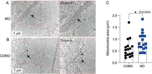 Fig. 4 Ultrastructural analysis of MO and COMO zebrafish. (A) Transmission electron microscopy images of the MO group, with arrows indicating abnormally enlarged mitochondria. (B) Transmission electron microscopy images of the COMO group, with arrows indicating normally shaped mitochondria. (C) Statistical analysis revealed a significant increase in the mitochondrial cross-sectional area within the muscle fibers of the MO group zebrafish compared to the COMO group (P = 0.0335). All data are shown as means ± SD. *P < 0.05. Statistical significance is calculated using Student’s two-tailed t test.