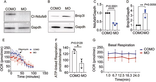 Fig. 6 (A-D) Ndufa9 (located in complex I) protein expression was significantly down-regulated in the MO group. Bnip3l protein expression was significantly elevated in the MO group compared with the COMO group. (E) Figure showing the oxygen consumption rate (OCR) curves of the COMO group and the MO group. The difference in the OCR between the COMO group and the MO group before and after the addition of oligo was significant, and the arrow indicates the time of oligo addition (n = 3). (F) The statistical analysis of ATP production capacity (n = 3). (G) Determination of the basic OCR of zebrafish (n = 3). All the data are shown as the means ± SDs. *P < 0.05, **P < 0.01, ***P < 0.001. Statistical significance was calculated via Student’s two-tailed t test.