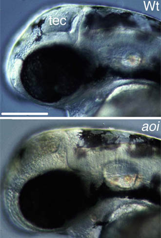 OPTICS: MAGNIFICATION: DATE OF IMAGE: SUBMITTER COMMENTS: Wild-type embryo (top); mutant embryo (bottom) identifiable by tectal degeneration. Scale bar, 100 um.