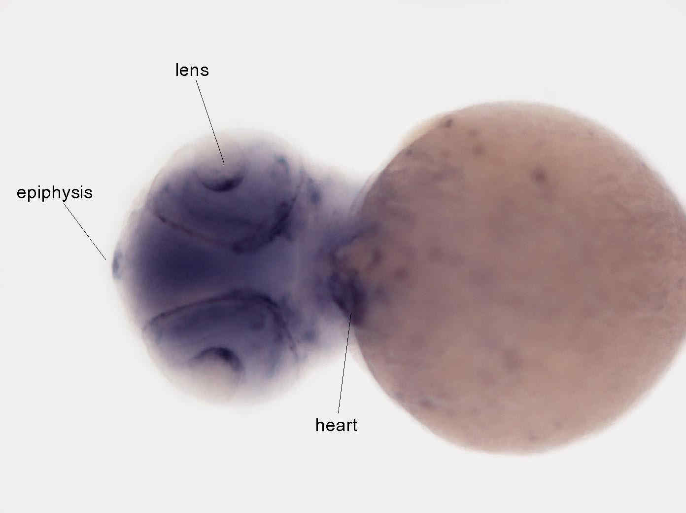 Fig. 6 basal level of expression in the head, more staining in epiphysis, heart, lens and muscles