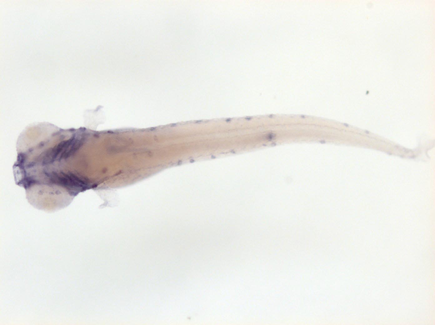 Please note that in 5 day old embryos some structures are not accessible to the probe (such as notochord, most of the trunk and tail). Therefore the description of the expression pattern is only partial.