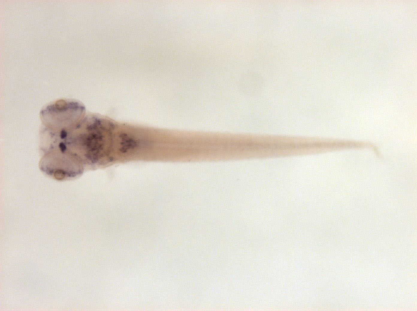 Please note that in 5 day old embryos some structures are not accessible to the probe (such as notochord, most of the trunk and tail). Therefore the description of the expression pattern is only partial.