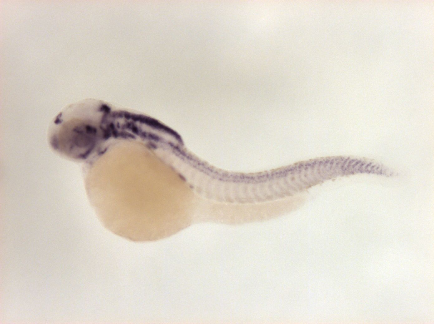 Fig. 5 nose, epiphysis, ventral posterior tegmentum, dorsal cerebellum, dorsal hindbrain, cranial ganglia, nuclei in ventral hindbrain, ventral part of retina, habenula (left, very weak expression on right side), hypaxial part of anterior somites, spinal chord neurons.