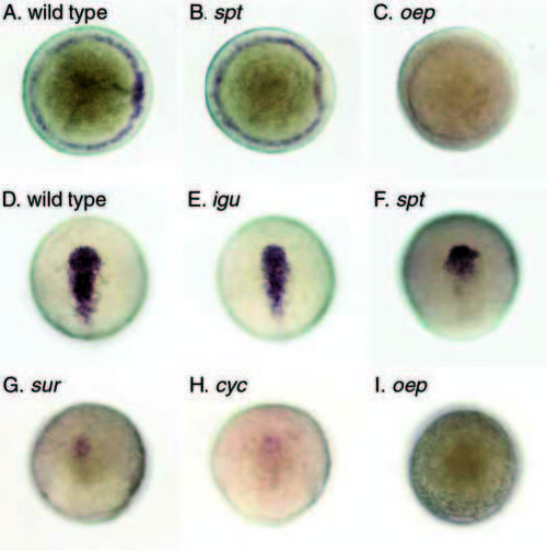 Mesendoderm expression of pitx2c is dependent on spt, oep, sur and cyc. In situ hybridizations using a full-length pitx2 probe are shown. (A-C) Mesendoderm expression of pitx2 at 50% epiboly. (A) Wild-type embryo. (B) spt and (C) oep mutant embryos. Animal pole views are shown with dorsal to the right. (D-I) Dorsoanterior views with the anterior at the top showing the prechordal plate expression of pitx2 at 80-90% epiboly. (D) Wild-type embryo. (E) igu, (F) spt, (G) sur, (H) cycb229 and (I) oep mutant embryos. EXPRESSION / LABELING: