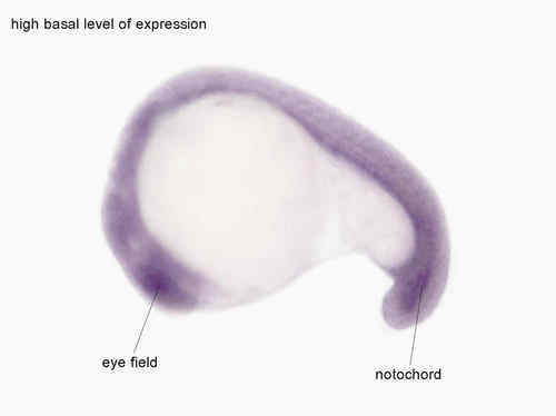 Fig. 4 High level of basal expression, more staining in notochord, retina, tectum EXPRESSION / LABELING: