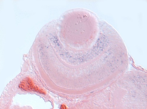 Expressed in retina, central nervous system (with more labelling in tectum, posterior hindbrain and anterior spinal chord), in branchial arches. In retina expression is stronger in the ganglion cell layer. No labelling is observed in the photoreceptor cell layer. |