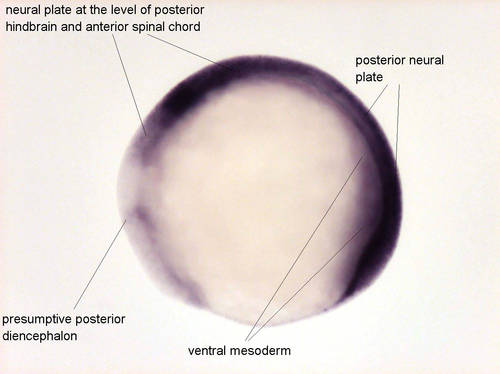 Expressed in the neural plate at the level of the forebrain-midbrain boundary in presumptive posterior diencephalon, in hindbrain with a stronger expression in rhombomere 5 and in presumptive spinal chord. Also expressed in ventral mesoderm EXPRESSION / LABELING: