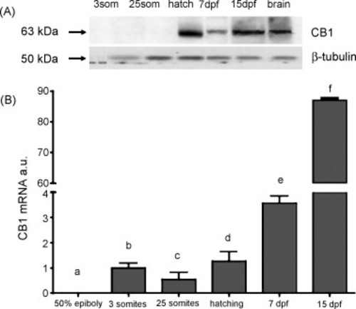 CB1 ontogeny during zebrafish development. CB1 receptor mRNA starts to be expressed at 3 somites stage (B) while its relative protein starts to be synthesized at hatching time. β-tubulin was used as control protein (A). Different letters indicate significant differences (p < 0.05). EXPRESSION / LABELING: