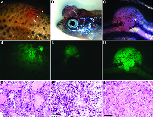 Zebrafish tumors induced by co-expression of zebrafish Smoa1 and constitutively active human AKT1. A, B and C, a 12-week-old fish with rhabdomyoma (A), showing GFP expression exclusively in the tumor (B); D, E and F, a 6-week-old fish with glioblastoma; G, H and I, a 8-week-old double transgenic fish with astrocytoma in the lower trunk region. Scale bars, 50 μm. EXPRESSION / LABELING: