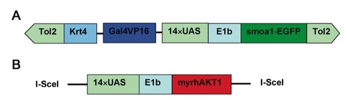 Overall strategy for co-expression of oncogenes in zebrafish. Stable transgenic lines expressing zebrafish Smoa1 were generated using a Tol2-based vector (A). Constitutively active human AKT1 (myrhAKT1) was incorporated into a meganuclease-based vector (B). The zebrafish krt4 promoter could simultaneously activate smoa1-EGFP and myrhAKT1 expression through Gal4VP16-UAS. |