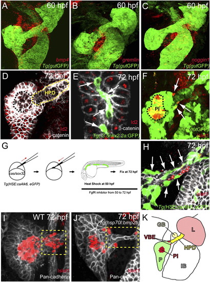 Activation of Bmp signaling cell-autonomously blocks the induction of ventral bud-derived endocrine cells. (A–C) Confocal images of Tg(gutGFP) (green) with mRNA expression (red) of bmp4 (A), gremlin1a (B), and noggin1 (C) at 60 hpf. (D and E) Confocal images of wild-type endoderm showing β-catenin (white) and Id2 (red) expression at 72 hpf. (D) Id2 expression is excluded from the hepatopancreatic duct cells (HPD; yellow dashed line) and appears to be downregulated or excluded from the pancreatic endocrine cells (PI, principal islet; black dashed line). (E) Id2 expression is also excluded from the intrapancreatic duct cells, labeled by Tg(-3.5nkx2.2a:GFP) expression (41) (green; arrows). (F) Confocal image of wild-type endoderm showing Tg(gutGFP) (green) and Islet1 (red) expression at 72 hpf. The ventral bud-derived endocrine cells (arrows) can be found at the junction between the pancreas and hepatopancreatic duct [the principal islet (PI) is outlined by black dashed line]. (G) Schematic diagram of the cell transplantation protocol. cas/sox32-overexpressing Tg(HSE:caAlk6, eGFP) donor cells were transplanted into wild-type hosts. Hosts were heat-shocked at 50 hpf and fixed at 72 hpf. After applying heat shock, hosts were treated with the Fgf receptor inhibitor SU5402, which induces ectopic Islet1-positive cells in the hepatopancreatic duct. (H) Single plane image of embryo stained for GFP (green), Pan-cadherin (white), and Islet1 (red) showing that Tg(HSE:caAlk6, eGFP)-expressing cells (arrows) fail to express Islet1 and display clear segregation from the ectopic Islet1-expressing cells (asterisks). (I and J) Effect of cell-nonautonomous activation of Bmp signaling by heat shock of Tg(hsp70l:bmp2b) at 50 hpf and subsequent treatment with SU5402 until fixation. Confocal projections of embryos stained for Pan-cadherin (white) and Islet1 (red) comparing control (I) and experimental (J) embryos. (I) Upon SU5402 treatment, ectopic Islet1-positive endocrine cells appeared in the hepatopancreatic duct (yellow dashed area), an effect that can be partially blocked by overexpression of Bmp2b (J). (K) Diagram of the endodermal organs at 72 hpf showing the liver (L; light red), pancreas (P; green), hepatopancreatic duct (HPD; yellow), gall bladder (GB; light yellow), and intestinal bulb (IB), as well as the ventral bud-derived endocrine cells (VBE; red) and principal islet (PI; red). |