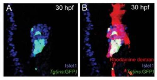 Control donor cells gave rise to pancreatic endocrine cells in host embryos without displaying an increased preference for an endocrine cell fate. (A and B) Confocal images of host embryos containing control donor cells (rhodamine dextran, red) at 30 hpf. Control donor cells incorporated into Islet1 (blue)-expressing pancreatic endocrine cells, and some of them differentiated into Tg(ins:GFP)-expressing pancreatic β-cells (green; triple-labeled cells appear white). For clarity, the red color is excluded in the corresponding Left panel (A). |
