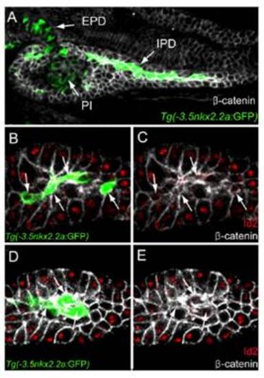 Expression of Id2 is excluded from the intrapancreatic duct cells. (A) Confocal image of Tg(-3.5nkx2.2a:GFP) expression (green), which strongly marks the intrapancreatic duct (IPD) cells and weakly marks the extrapancreatic duct (EPD) cells and endocrine cells adjacent to the principal islet (PI) at 72 hpf. β-Catenin (white) outlines the general morphology of the pancreas. (B–E) Id2 (red) is expressed in acinar cells but appears to be downregulated or excluded from the intrapancreatic duct cells (green; arrows) in distal (B and C) and proximal (D and E) regions of the pancreas. For clarity, the green color is excluded in the corresponding Right panels (C and E). |