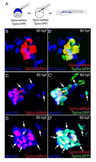 Mosaic knockdown of alk8 cell-autonomously generates ventral bud-derived β-cells. (A) Schematic diagram of the cell transplantation protocol. Tg (ins:GFP);Tg(ins:dsRed) donors were injected with cas/sox32 mRNA and alk8 splice-blocking MO along with Alexa Fluor 647 dextran (blue), and the donor cells were transplanted into Tg(ins:GFP);Tg(ins:dsRed) hosts. (B–C′) Confocal projections of Tg(ins:GFP)- and Tg(ins:dsRed)-expressing islets containing control (B and B′) and alk8 morphant (C–D′) donor cells (blue) at 60 hpf. Control donor cells incorporated into Tg(ins:GFP)- and/or Tg(ins:dsRed)-expressing β-cells without showing any preference. In contrast, alk8 morphant donor cells (blue) gave rise to many GFP-only–positive β-cells (arrows). For clarity, the green color is excluded in the corresponding Left panels (B–D). |