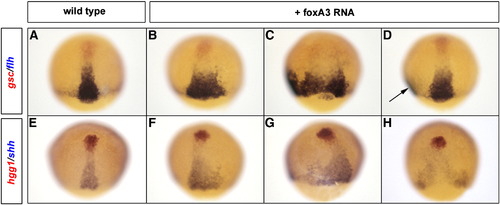 Gain of FoxA2 or FoxA3 function enlarges the axial mesoderm territory. Analysis of the axial mesoderm territory at midgastrula stage with two combinations of prechordal plate (red)/notochord (blue) markers, gsc/flh (A–D) and hgg1/shh (E–H). Embryos injected with foxA3 RNA present an enlargement of flh (B–D) and shh (F–H) expression domains compared to wild-type (A and E). When the axial mesoderm is massively enlarged, it splits in two distinct axes (arrow in D). Dorsal views, anterior up. EXPRESSION / LABELING:
