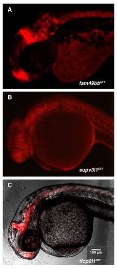 Gene-trap expression of mCherry in different mutagenized lines. (A) Image of fam49bbGtT/+ at 48 hpf. (B) Image of supv3l1GtT/+ at 24 hpf. (C) Image of tfcp2l1GtT/+ at 36 hpf. |