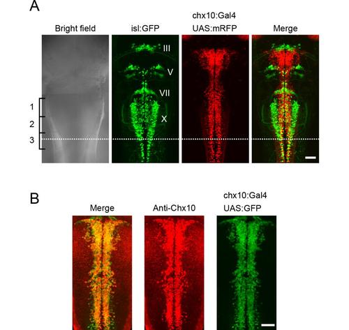 Hindbrain V2a neurons (A), A comparison of V2a neurons and cranial motoneurons in the hindbrain. Triple transgenic fish of Tg[chx10:Gal4], Tg[UAS:mRFP] and Tg[isl1:GFP] at 3dpf. Dorsal views. Nuclei of cranial motoneurons are shown in Roman numerals. The caudal end of the vagal motoneurons (X) is located near the middle of the third muscle segment (dotted line). This was used as a landmark for defining the caudal end of the hindbrain in this study. (B), Immunostaining of Chx10 protein in a compound transgenic fish of Tg[chx10:Gal4] and Tg[UAS:GFP] at 2 dpf. Dorsal views. The distribution of Chx10-positive cells and GFP-positive cells mostly overlap. Scale bar, 50 μm. |