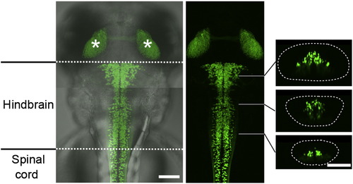 V2a Neurons in the Hindbrain Compound transgenic fish of Tg[chx10:Gal4] and Tg[UAS:GFP] at 3 dpf. The two panels on the left are dorsal views. GFP-expressing neurons are present in the hindbrain and the spinal cord. The asterisks show the GFP signal in the tectums that are originated from GFP-positive cells in the retina. The three panels on the right are cross-sections. The dotted circle demarcates the hindbrain. Scale bar represents 100 μm. |