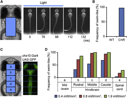 Activation of Hindbrain V2a Neurons Elicits Swimming Compound transgenic fish of Tg[chx10:Gal4] and Tg[UAS:ChR] at 3 dpf were used in the experiments. (A and B) A flash of blue light (0.4 mW/mm2, 100 ms) was applied to the boxed area (left panel in A). This evoked swim-like behavior (right panels in A). (B) Frequencies of eliciting swim-like behavior. “WT” represents wild-type larvae, whereas “ChR” represents larvae that expressed ChR in V2a neurons. n = 35, 7 animals for both cases. (C and D) Region-specific photo stimulations were applied. The hindbrain was divided into three regions (b, rostral; c, middle; d, caudal). Photo stimulations were applied to each region. In addition, photo stimulations were applied to the midbrain (a) and spinal cord (e). (D) Frequencies of eliciting swim-like behaviors with different stimulation sites and different stimulation strengths. The duration of the stimulation was 100 ms. |
