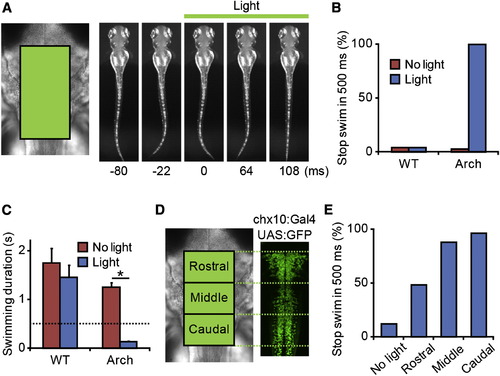 Inactivation of Hindbrain V2a Neurons Stops Ongoing Swimming Compound transgenic fish of Tg[chx10:Gal4] and Tg[UAS:Arch] at 3 dpf were used in the experiments. (A–C) Green light (30.5 mW/mm2, 500 ms) was applied to the boxed area (left panel in A) after swimming started (onset latency of the illumination was 200–400 ms). The application of the light stopped swimming (right panels in A). (B) Frequencies of stopping swimming within the illumination periods (500 ms). “WT” represents wild-type larvae, whereas “Arch” represents larvae that expressed Arch in V2a neurons. “No light” represents control experiments in which green light was not applied. In these cases, the duration of swimming was measured after the onset of the electric signal that would turn on illumination with the DMD. In nearly 100% of the trials, the application of green light stopped ongoing swimming in Arch-expressing larvae. Arch: n = 35, 7 animals; WT: n = 25, 6 animals. (C) Mean duration of swimming after the onset of illumination. Bars indicate SE. The dotted line indicates the illumination time. In the case of Arch-expressing larvae, the duration of swimming was significantly shorter (t test; p < 0.001). Arch: n = 35, 7 animals; WT: n = 25, 6 animals. (D and E) Green light (30.5 mW/mm2, 500 ms) was applied in a region-specific manner. (D) Illumination areas are shown. (E) Frequencies of stopping swimming within the illumination periods (500 ms). “No light” represents control experiments in which green light was not applied. n = 25, 5 animals. |