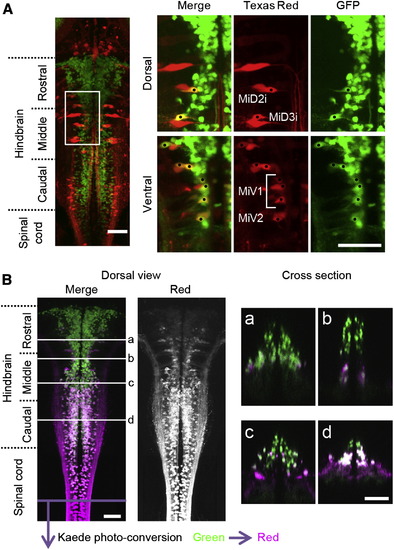 V2a Neurons that Project to the Spinal Cord(A) Texas red-Dextran was backfilled into a compound transgenic fish of Tg[chx10:Gal4] and Tg[UAS:GFP] at 3 dpf. Several ipsilaterally projecting large reticulospinal neurons, including MiD2i, MiD3i, MiV1, and MiV2 neurons, are GFP positive, showing that they are among the V2a neurons. The dots indicate neurons that are double positive for Texas red and GFP. (B) Kaede protein in the spinal cord of Kaede-expressing fish (Tg[chx10:Gal4] and Tg[UAS:Kaede] at 3 dpf) was photo converted by application of violet light to the spinal cord. After photo-converted Kaede (from green to red) was transported from the axons to the somata (8 hr waiting time), the observation was made. Green shows the distribution of green Kaede, whereas magenta shows the distribution of red (photo-converted) Kaede. The majority of V2a neurons in the caudal hindbrain are positive for Red-Kaede. In the more rostral region, the number of Red-Kaede-labeled neurons gradually became smaller. Subpanels of (a)–(d) show cross-sections. Scale bar represents 50 μm. |