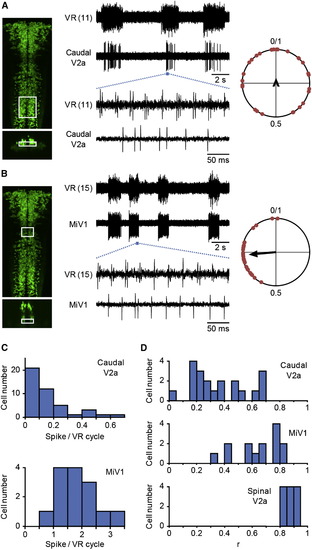 Activity of Hindbrain V2a Neurons during Fictive Swimming Compound transgenic fish of Tg[chx10:Gal4] and Tg[UAS:GFP] at 3 dpf were used for electrophysiological recordings. Loose-patch recordings from reticulospinal V2a neurons were made together with VR recordings. (A and B) (A) shows an example of recordings from the small reticulospinal V2a neurons in the caudal hindbrain, whereas (B) shows an example of recordings from the MiV1 neurons. The left panels show the region of the cells that were recorded. The top panel for each figure is a dorsal view, whereas the bottom panel is a cross-section. Middle panels show recordings. The numbers in parentheses indicate the locations of the VR recordings. The right panels show circular plots that depict the phasic relation of V2a neuron spikes to the VR activity. The central time point of a VR activity was assigned a phase value of zero and that of the next VR activity was assigned a phase value of one (Figure S5 C). The phase values of 30 randomly selected spikes are plotted in the circle. The direction of the vector shows the mean of the phase value, whereas the length of the vector shows the strength of the rhythmicity. (C) Histograms of the number of spikes of reticulospinal V2a neurons per VR cycle. The top panel shows a histogram of the small reticulospinal V2a neurons in the caudal hindbrain, whereas the bottom panel shows a histogram of the MiV1 neurons. n = 44 for the former, and n = 14 for the latter. (D) Histograms of the length of the vectors (“r”). The top panel shows the histogram of the small reticulospinal V2a neurons in the caudal hindbrain. In this histogram, only those neurons whose firing frequencies were more than 0.1 are included. n = 20. The middle panel shows the histogram of the MiV1 neurons. n = 14. The bottom panel shows the histogram of the spinal V2a neurons. This figure is shown for comparison purposes. n = 12. |