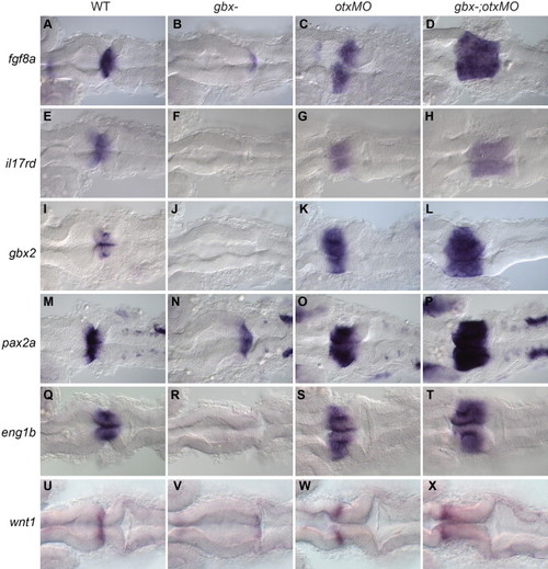 MHB gene expression in gbx-, otxMO, and gbx-;otxMO embryos. |