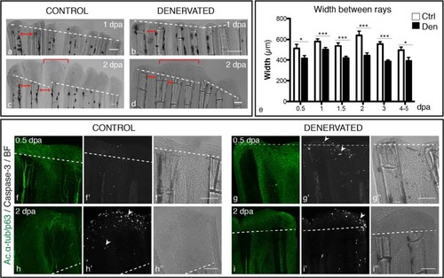 Width of regenerated fins, upon denervation. a-d) Brightfield images show that the inter-ray region of denervated fins is reduced in relation to controls. Additionally, “merged blastemas” (bracket) are observed on consecutive rays at 2 dpa (d), in contrast to single-ray blastemas found in control fins (c). Solid red arrowed lines indicate the inter-ray width. e) Quantification of inter-ray width. Measurements of rays and inter-ray units show that width of denervated fins is significantly smaller than that of the controls (***p < 0.0001, *p < 0.05). f-i) Apoptosis in whole mount amputated fins. Staining for activated caspase3 and ac. α-tub/p63 in whole mount fins activity reveals an increase in apoptotic cells in the WE and in the inter-ray region (arrowhead) of denervated fins, during the first day after amputation (g′). At 2 dpa, activated caspase-3 is expressed in the epidermis of both control (h′) and denervated and fins (i′). a-d, f-i) The images are a projection of confocal optical slices. Dashed lines mark amputation plane. Scale bar - 100 µm. |