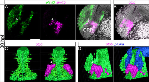 3D demonstration of the subdivision in the ORR. (A–B): Single confocal plane of a lateral view of a 30hpf forebrain following elavl3 and sim1a (A) or otpb (B) in situ hybridization and DAPI staining (gray). (C–D): 3D rendering from confocal images following otpb and pax6a in situ hybridization and DAPI staining, illustrated in a frontal (C) and a lateral (D) views. Ventricle shape of the optic recess (OR) was deduced from DAPI staining and segmented manually using ITK-SNAP 2.4.0. otpb- and pax6a-positive domains were segmented semi-automatically using ITK- SNAP 2.4.0. The expression of sim1a and otpb delineates the dorsal limit of the ORR (arrow heads), which fits the inversion of the curvature of the ventricle (C and D). Pax6a (D), which is known to be expressed in the dorsal domain of the forebrain, shows the complementary expression pattern with otpb. Scale bars = 50µm. |