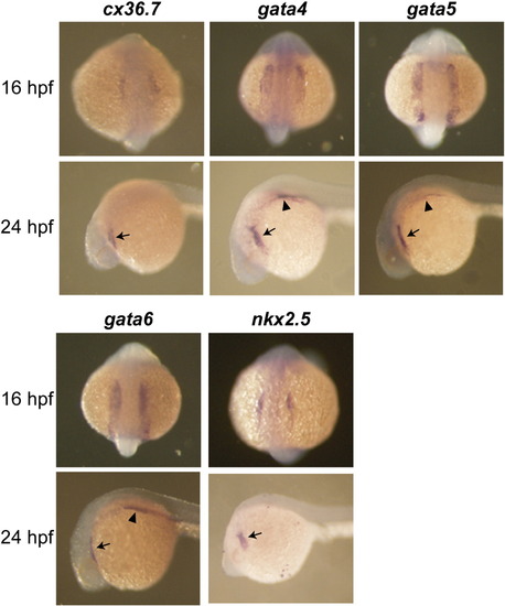 The expression of cx36.7, gata4, gata5, gata6 and nkx2.5 in zebrafish embryos. Whole mount in situ hybridization of zebrafish embryos at 16 hpf (top) and 24 hpf (bottom) was performed with antisense RNA probes specific to cx36.7, gata4, gata5, gata6 and nkx2.5. The cx36.7 expression was detected in the developing heart regions in which gata4, gata5, gata6 and nkx2.5 are expressed. Arrows, hearts; arrowheads, gut. EXPRESSION / LABELING: