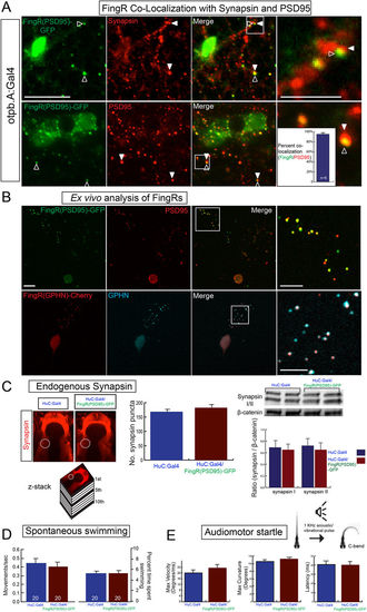 Transgenic FingR lines reflect endogenous synapses and do not affect synapse number or behavior. (A) FingR(PSD95)-GFP signal is adjacent to Synapsin immunohistochemistry (top panels) and overlaps PSD-95 immunohistochemistry (bottom panels). Quantification of FingR(PSD95)-GFP signal and endogenous PSD-95 signal demonstrates 95% overlap of PSD-95 immunohistochemistry with GFP signal from FingR (bar graph: median 95% +/− 1%, SEM; n = 6 larvae; p 0.01). Confocal images of sections from immunostained Tg(otpb.A:Gal4); Tg(FingR(PSD95)-GFP) larvae, scale bar 10 μm, 5 μm in inset panels. (B) Ex vivo sparse zebrafish primary neuron cell culture demonstrates co-localization of FingRs and endogenous synaptic proteins. Top row, dissociated neurons from Tg(otpb.A:Gal4); Tg(FingR(PSD95)-GFP) embryo, immunohistochemistry for anti-GFP and anti-PSD95. Bottom row from Tg(HuC:Gal4); Tg(FingR(GPHN)-Cherry) embryo, immunohistochemistry for anti-mCherry and anti-GPHN. Confocal images of slides, scale bar 10 μm, 5 μm in inset. (C–E) Pan-neuronal expression in Tg(FingR(PSD95)-GFP); Tg(HuC:Gal4) larvae. (C) FingR(PSD95)-GFP expression does not affect Synapsin protein expression. Data is double-transgenic larvae compared to Tg(HuC:Gal4) only. Images are confocal z-stacks, dorsal views, rostral to top; dotted circle indicates area of Synapsin puncta quantification for bar graphs. Western blots are for Synapsin in whole larvae, standardized to β-catenin; quantified bar graphs to right. (D) FingR(PSD95)-GFP expression does not affect spontaneous swimming behavior (percent time swimming and number of movements), n = 20 embryos each test; three separate experiments; SEM. (E) FingR(PSD95)-GFP expression does not affect audiomotor startle response, n = 27 (control) and 30 (FingR) embryos each test; three separate experiments, SEM (velocity, body curvature, or latency). |