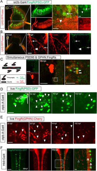FingR constructs and testing in zebrafish. (A) Schematic diagram of FingR constructs used to generate plasmids and transgenic lines. FingR(PSD95)-GFP binds endogenous PSD-95 protein at the post-synaptic density; FingR(GPHN)-Cherry binds endogenous GPHN. (B) Use of inducible Gal4/UAS system with FingR(GPHN) or FingR(PSD95) in different Gal4 lines for differential synapse labeling (drawn by JHS). (C) Contrasting examples of unregulated (FingR-GFP) and regulated (FingR(PSD95)-GFP) FingR plasmids injected into Tg(otpb.A.Gal4) embryos. GFP signal from the unregulated FingR is distributed throughout the neuron and neurites (arrows) and individual synaptic puncta are not visualizable. In contrast, distinct puncta are seen (open arrowheads) using regulated FingR expression. Confocal images, scale bar 50 μm, 10 μm in inset panels; confocal z-stacks, ventral views, rostral to the top. D) Demonstration of puncta labeling with regulated FingR for GPHN. Confocal z-stacks, ventral view, rostral to top, of Tg(otpb.A:Gal4) embryo injected with FingR(GPHN)-Cherry. Arrows, neuron soma; arrowheads, puncta. Scale bar 50 μm, 10 μm in inset panel. |