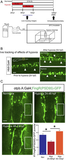 FingRs reveal impairment of synapse development by developmental hypoxic injury. (A) Schematic illustration of hypoxia exposure and imaging. (B) Demonstration of live imaging of effects of hypoxic injury on motor neuron synaptic puncta visualized by FingR(PSD)-GFP in trunk of Tg(Hb9:Gal4); Tg(FingR(PSD95)-GFP) animals. Following hypoxia there is a decrease in the number of puncta labeled by FingR(PSD95)-GFP. Confocal images, rostral to left, scale bar 10 μm. (C) Confocal images and quantification in the dopaminergic neurons in the diencephalon of Tg(otpb.A:Gal4); Tg(FingR(PSD95)-GFP) animals. Hypoxia from 24–48 hpf decreased number of puncta but later hypoxia exposure did not significantly change number; (p = 0.002; one-way ANOVA; SEM shown). Confocal z-stacks, rostral to top, scale bar 10 μm. |