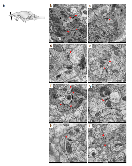Ultrastructure of synapses from Zebrafish olfactory bulb. (a) Schematic representation of the zebrafish brain. The black line indicates the position of the olfactory bulb. (b-i) PSDs found in different areas of the olfactory bulb. Arrowheads indicate PSDs from dendro-dendritic synapses. Scale bars b-c and e-i 500 nm; scale bar d 200 nm. |