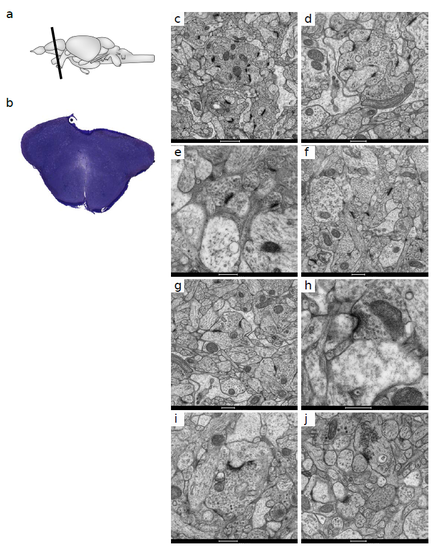 Ultrastructure of synapses from Zebrafish telencephalon. (a) Schematic representation of the zebrafish brain. The black line indicates the position of the telencephalon. (b) Coronal semi-thin section of the zebrafish telencephalon stained with toluidine blue. (c-j) PSDs found in different areas of the telencephalon. Scale bar c 1 μm; scale bars d-j 500 nm. |