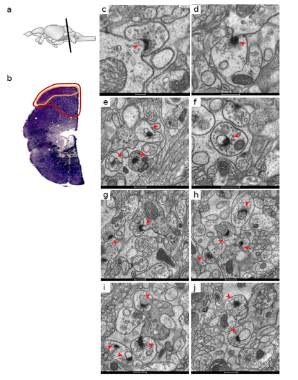 Ultrastructure of synapses from Zebrafish optic tectum. (a) Schematic representation of the zebrafish brain. The black line indicates the position of the midbrain. (b) Coronal semi-thin section of the zebrafish midbrain stained with toluidine blue. The red encircled area corresponds to the optic tectum. The orange line indicates the area where asymmetric synapses were identified. (c-j) PSDs found in different sections of the optic tectum. Arrowheads denote PSDs of postsynaptic elements showing either a small diameter or microtubules underneath. Scale bars c-j 500 nm. |